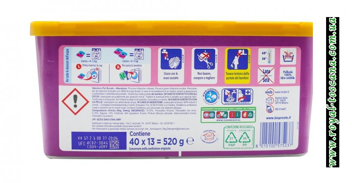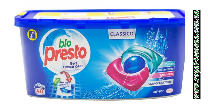Bio Presto немає неможливого забруднення, вже понад 55 років союзник італійських сімей проти плям; сьогодні вся його ефективність також міститься в зручній технології попереднього дозування Bio Presto Power Caps! Завдяки інноваційній формулі Total 3+1 Bio Presto глибоко проникає у волокна, забезпечуючи чистий, блискучий, свіжий одяг.
