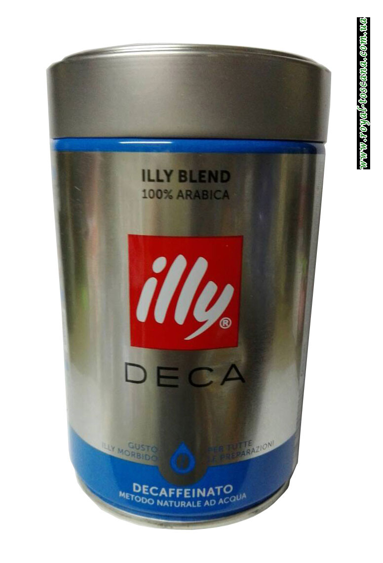 Кофе Illy Deca молотый, без кофеина, качественной 100% арабики в жестяной банке. Этот элитный безкофеиновый напиток (содержание кофеина в нем менее 0,05%) ничем иным от привычного для большинства кофе не отличается. Кофе Illy Deca молотый, без кофеина, также дарит чрезвычайно приятный стойкий аромат и незабываемый вкус. Это изобретение, созданное для тех почитателей кофе, кому кофеин противопоказан, отличается от предыдущего (Illy Deca) инновационным методом обработки зерна, в основе которого — удаление кофеина с помощью чистой питьевой воды. Считается, что такой подход делает Кофе Illy Deca более экологичным и более полезным.