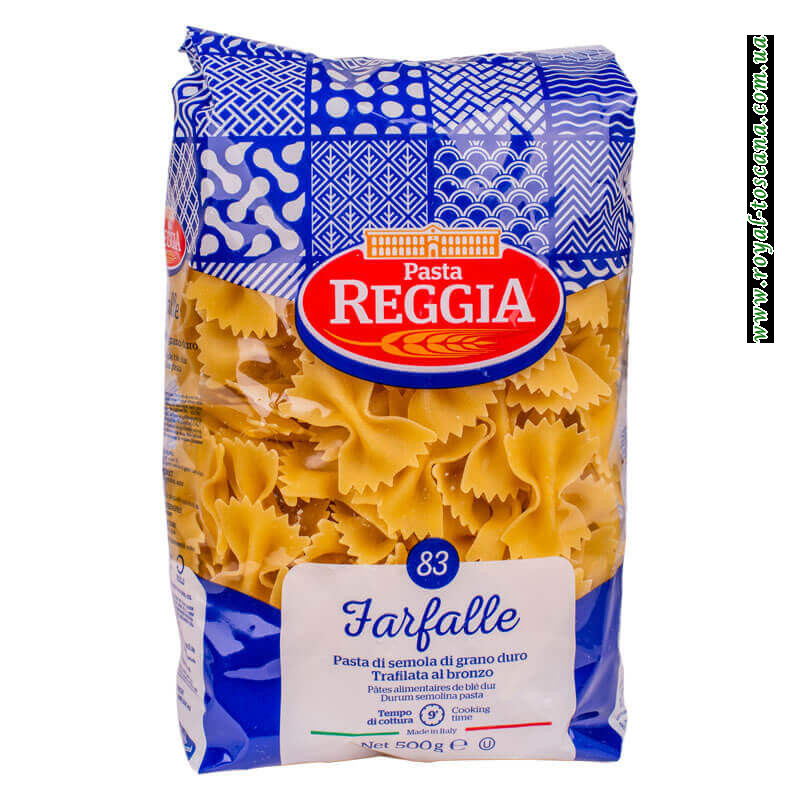 Макароны бантики Pasta Reggia Изготовлены из твердых сортов пшеницы. Время приготовления 9 минут.