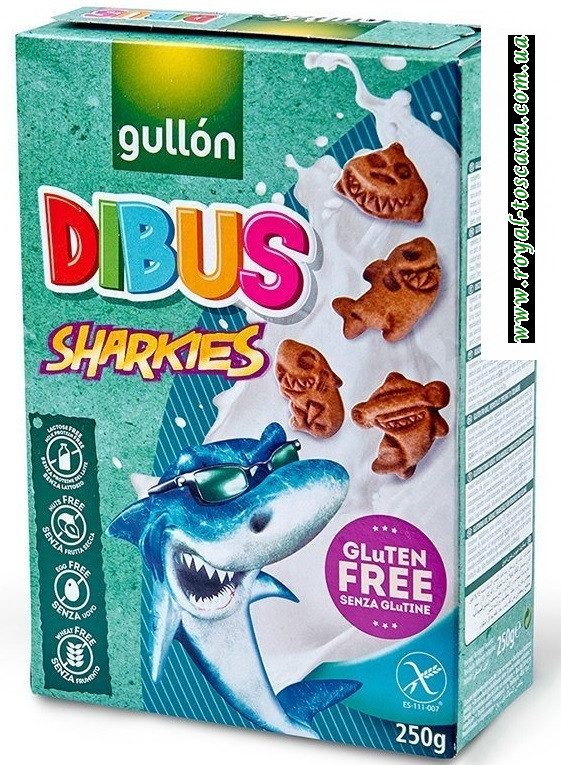 Gullon, Іспанія / Dibus Sharkies Gluten Free / шоколадне безглютенове печиво без лактози та яєць у фігурній формі акулок - спеціально для дітей / створене на основі кукурудзяного та рисового борошна без глютена, з додаванням насиченого какао / печиво має хрустку текстуру та м'який збаланс. ідеально поєднується з кухлем гарячої кави, ароматного чаю та молочного какао / варіант ситного солодкого перекушування для дітей та дорослих / печиво є надійним джерелом клітковини та високоолеїнової соняшникової олії / не містить глютен та горіхи, лактозу та яйця / 100 г = 459 ккал формат упаковки / 250 г