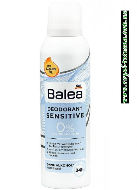 Особливості дезодоранту-антиперспіранта Sensitive Balea: - містить олію кокоса; - безпечна формула - не містить спирту, мікропластику, алюмінію; - ніжний, свіжий аромат; - виконує функції антиперспіранту; - забезпечує 24-годинний захист від запаху поту; - підходить для чутливої шкіри;