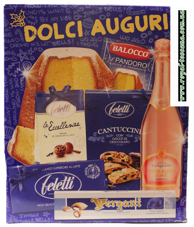 Отличный выбор в качестве подарка. Набор содержит: бутылку шампанского, миндальное печенье, молочный шоколад, туррон, шоколадные конфеты, Панеттоне
