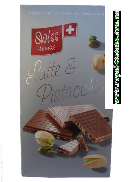 Шоколад Swiss deluxe Latte E Pistacchio - молочный шоколад с мягким, нежным, завершенным вкусом. Использование отборных фесташек, идеально подобранных в соотношение с какао обеспечивает отменные вкусовые качества.
