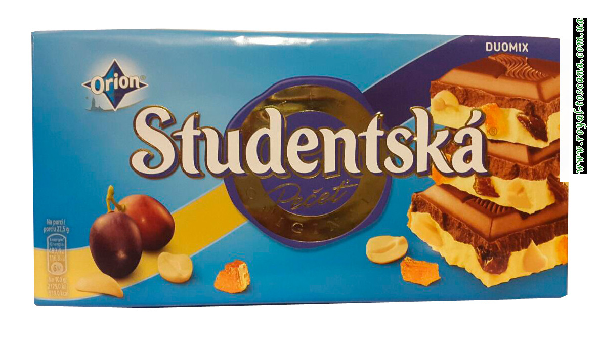 Шоколад белый и темный с кусочками желе с изюмом и арахисом. Это европейское качество от известного производителя Orion. Studentska Pecet изготавливается в Чехии с 1975 года с соблюдением традиционной рецептуры. Шоколад является источником энергии и хорошего настроения. Нежный вкус шоколада прекрасно сочетается с разнообразной начинкой.