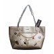 Сумка изготовлена из качественной эко кожи серебристого цвета, спереди украшена стильными фигурками. В данной модели есть один большой отдел с маленькими кармашками внутри. Большие ручки, будет удобно носить как на руке, так и на плече. Спереди есть кармашек на замочке. Фурнитура выполнена в золотистом цвете. Стильная, практичная и очень удобна в использовании большая сумочка.