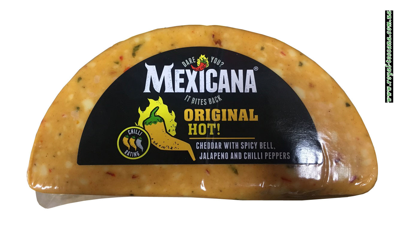 Необычный острый сыр Чеддер Mexicana, с традиционными специями произведенный в городке Илчестер. Твёрдый сыр Чеддер Mexicana, с добавлением халапеньйо, чили и красной острой паприки. Обладает огненно-острым вкусом и ароматом. Обязательный компонент сырной тарелки, идеален для бутербродов, в качестве закуски. Производится из пастеризованного коровьего молока. Содержит 48% жира.
