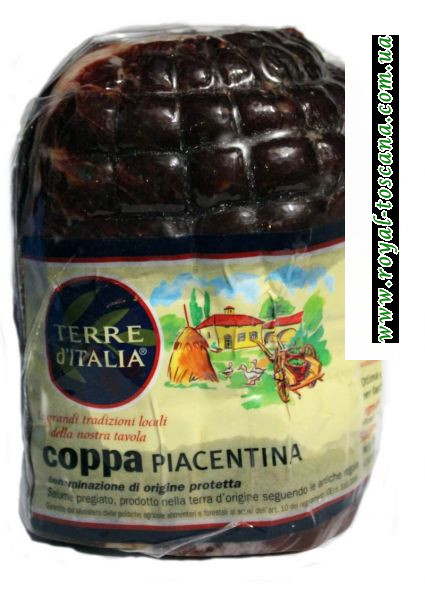 Салями-coppa piancetina Terre d'italia - является традиционным итальянским салями приготовленного из плеча или шеи свинины, вяленой целиком. Первоначально свежее мясо замачивают в красном или белом вине с чесноком и приправами. Подвешивают и выдерживают в тени 6 месяцев.