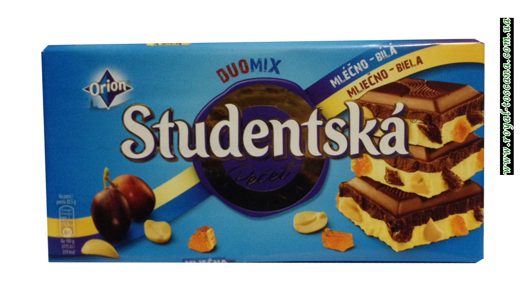 Шоколад белый и молочный с кусочками желе с изюмом и арахисом. Это европейское качество от известного производителя Orion. Studentska Pecet изготавливается в Чехии с 1975 года с соблюдением традиционной рецептуры. Шоколад является источником энергии и хорошего настроения. Нежный вкус шоколада прекрасно сочетается с разнообразной начинкой.